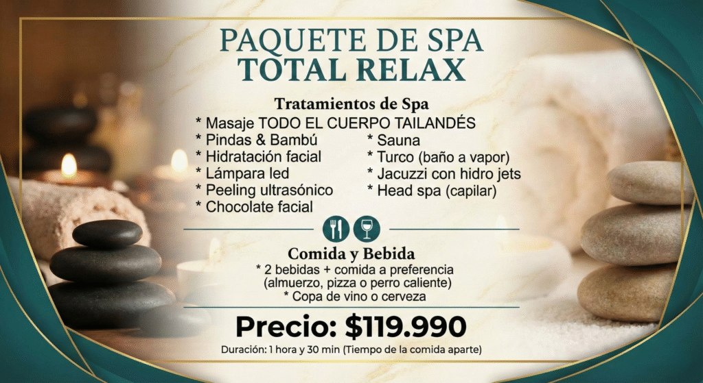 Vive una completa transformación con nuestro Plan Camaleón, diseñado para tu descanso total. La experiencia inicia en el circuito de aguas con sauna, baño turco y jacuzzi para una relajación profunda. Después, te consentimos con un facial de chocolaterapia y liberamos toda tu tensión con un masaje descontracturante de 20 minutos, un masaje craneal y reflexología podal. Para finalizar este día perfecto, disfruta de dos cervezas, una botella de vino sin alcohol, dos copas de fruta y un delicioso brownie con helado.